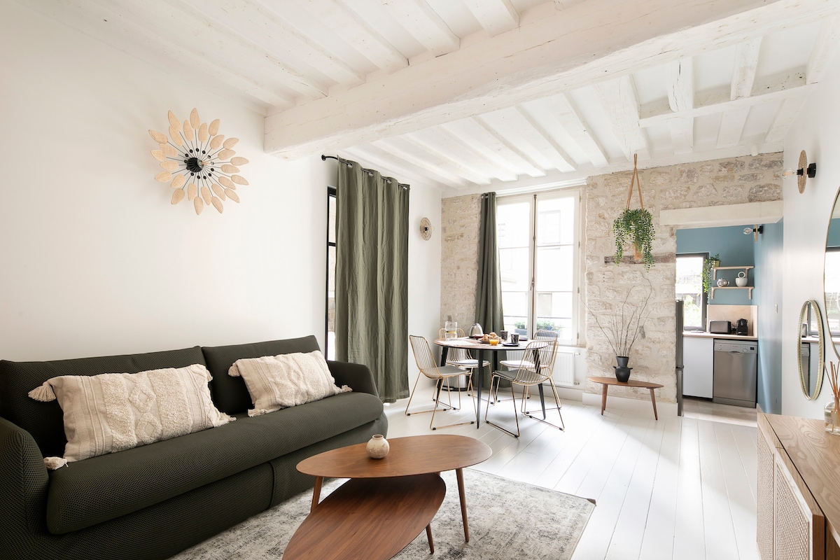 位於一棟 16 世紀建築的二樓(美國人稱三樓),在一個安靜的死胡同中,但仍位於巴黎市中心,充滿魅力和舒適。 外露的橫樑、磚地、現代裝飾、來自世界各地的藝術品、50 平方公尺的大客廳、2 間臥室和 2 間浴室、充滿活力的商業區,附近有各種交通工具。 客廳內有一張可折疊的單人沙發床(展開後,床的尺寸為 80 公分 x 190 公分)。 注意:沒有電梯。