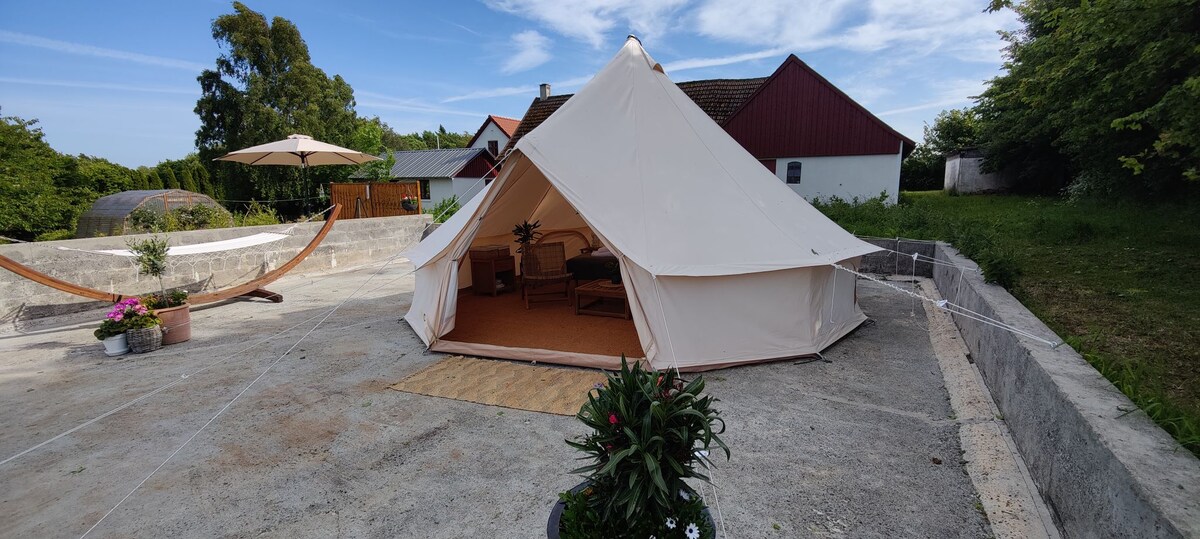 在擁有200年歷史的農場草地上的美麗豪華露營帳篷中享受大自然和寧靜,坐落在Paradisbakkerne和Svaneke附近的風景優美的區域。 探索我們的菜園、雞舍和花園。 帳篷設備精良,配有雙人牀。 帳篷旁邊有一個戶外廚房,提供您在火上烹飪所需的一切設施。 可使用農舍內的私人廁所和溫水淋浴間,以及帳篷旁的室外淋浴間(冷水)。