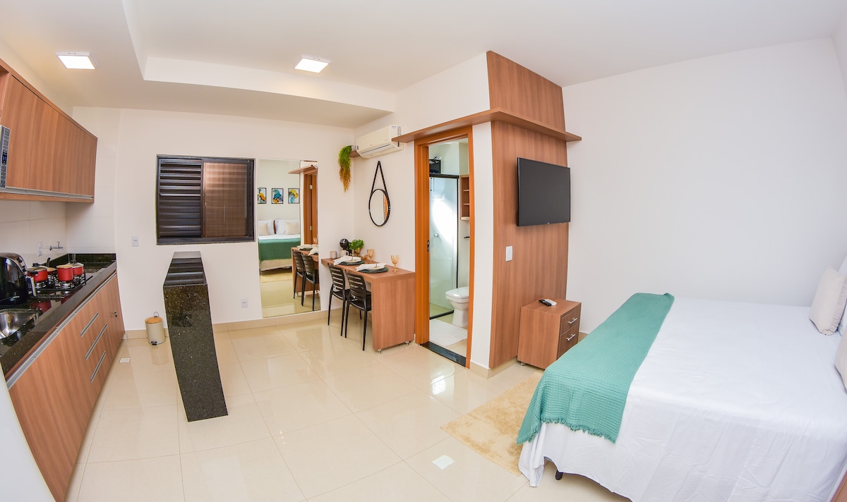 Relaxe em um Estúdio Estiloso e Tranquilo com Comodidades Completas! * Acomodações Confortáveis! * Cozinha Completa! * Conforto e Praticidade - Banheiro privativo, ar-condicionado, mesa de estudo e guarda-roupas com gavetas e cabides * Entretenimento e Conectividade - Wi-Fi com internet de ultra velocidade e smart TV para suas horas de lazer. * Comodidades do Condomínio - Aproveite a praticidade de um mercadinho completo 24h no condomínio!