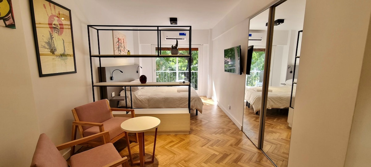 Hermoso monoambiente a estrenar ubicado en el barrio de Palermo.El apartamento tiene todas las comodidades para que disfrutes de una excelente estadía en Buenos Aires. Wifi , TV con cable 50 pulgadas , cama matrimonial, cocina totalmente equipada (horno eléctrico, microondas, tostadora, pava eléctrica, etc). El apartamento se encuentra en un piso 6 lo que permite tener luz durante todo el día.