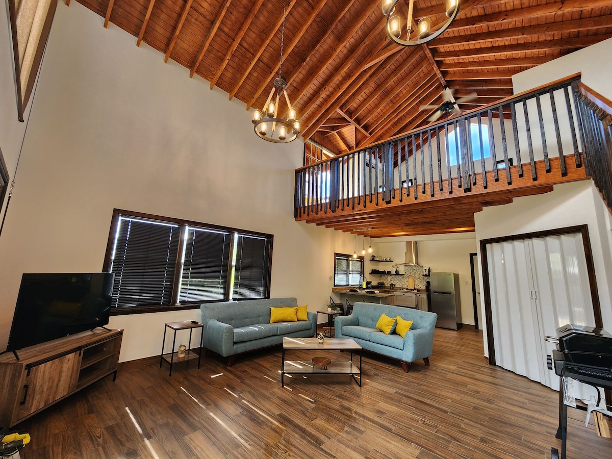 在這個獨特且寧靜的度假屋慢慢品味生活之美,入住我們位於波多黎各山區的寧靜、現代且美麗的美國開放式兩層小木屋。 THE COZY CÀSATA有一間配有電視的客廳、一間設備齊全的廚房、一個辦公空間、一個洗衣房、兩間全功能浴室、一間配有加大雙人床的開放式臥室、衣櫃空間和一個位於高層陽臺的小酒館,可欣賞浪漫的日出景觀。這裡還有一個前門廊,如果需要,您可以使用烤架。