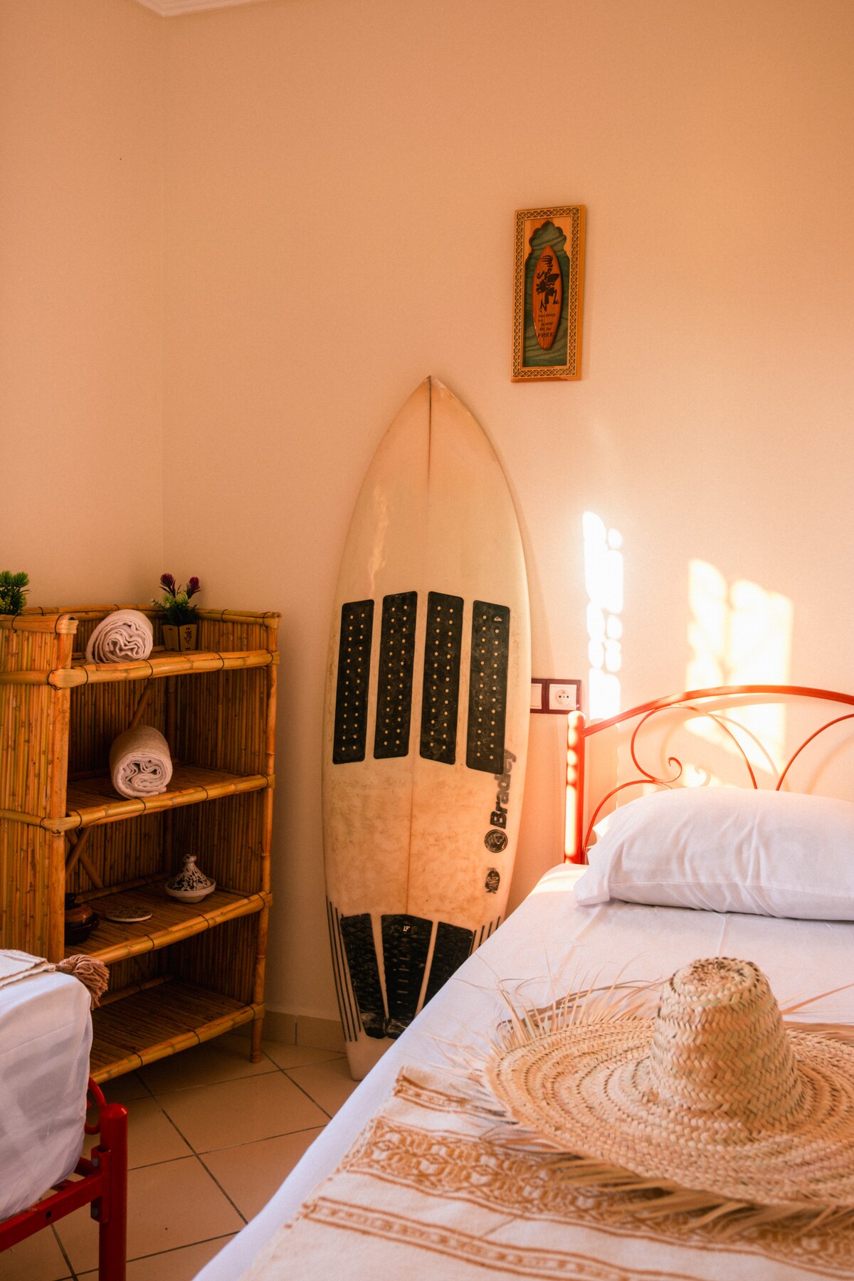 Cozy twin room inspired by the traditional charm of Fez, offering a peaceful and bright space to relax after a surf day. Located on the second floor of Nomazigh Surf House, guests can enjoy access to the chill terrace, co-working area and a rooftop with ocean view. Just a short walk to local bakery (1 min), Happy Tamraght restaurant (2 min), and Manzili Co-working (4 min). Close to popular surf spots like Devil’s Rock and Banana Point.