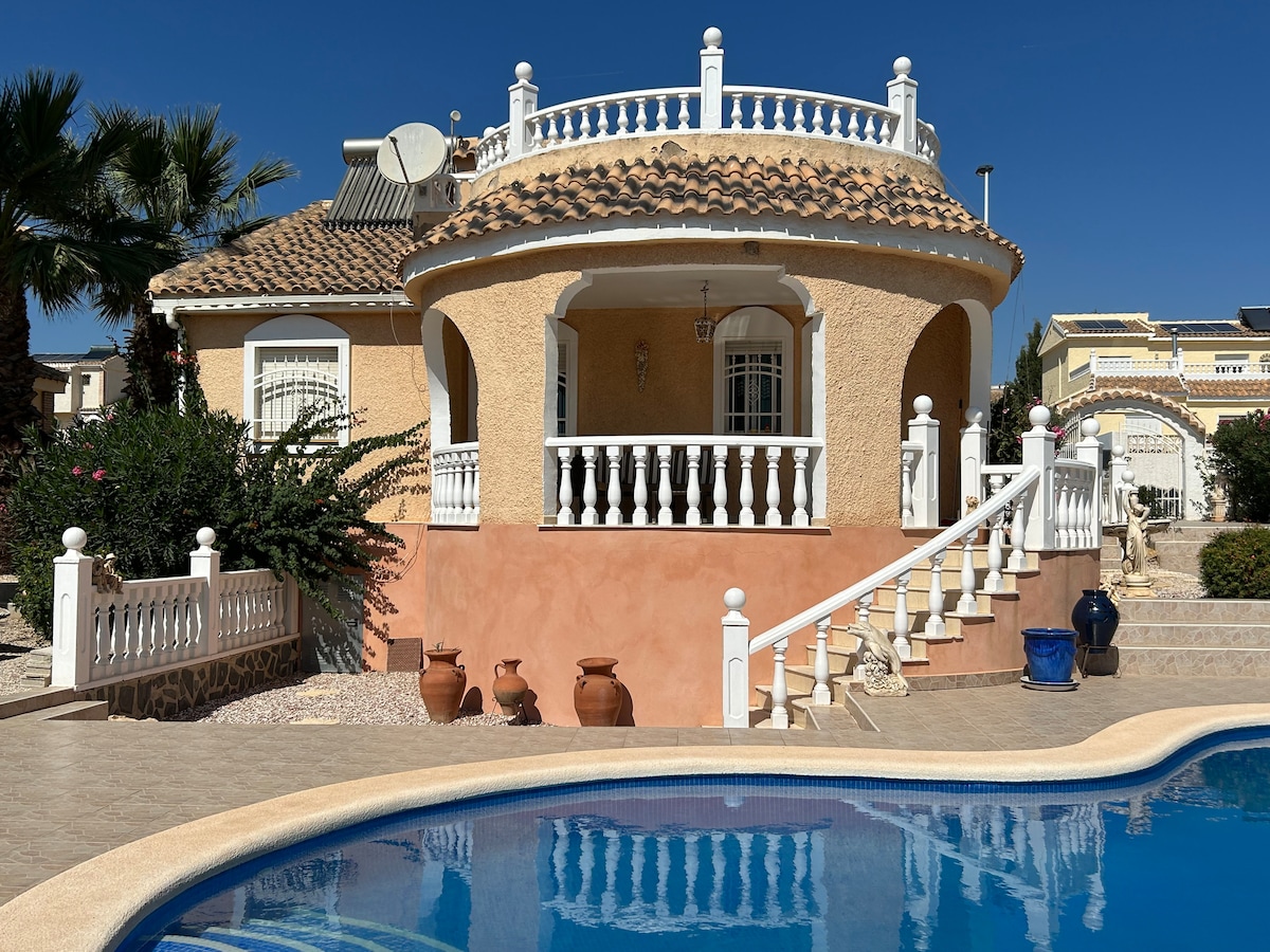 House, max of 6 people 👫👫👫 Are you looking for a real Spanish house with nice corners and charm in a peaceful landscape, and space for your children around the house ? ✔East, -south and west oriented corner home😀 ✔ Cabrera mountains, distant sea view ✔Covered front terrace ✔ roof terrace ✔Outside dining in sun/or shade ✔1 swimming pool, big and 1pool for the little ones ✔Gated community, ideal with children ✔3 minutes walking to Hotel Valle Del Este ✔Bar, restaurant, bakery on foot