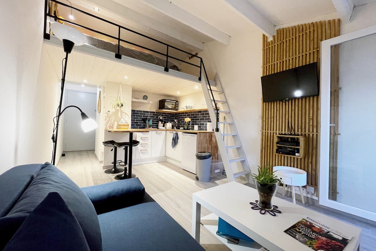 公寓位於中世紀城市的邊緣(500 公尺),交通便利,有私人停車場。距離海濱度假村6公里。乘坐TER火車(1歐元)可輕鬆抵達,火車站距離住所150公尺,下車後步行2分鐘即可抵達海灘。您位於卡馬格的中心地帶 尼姆、亞爾、濱海聖瑪麗。 參觀迷人而獨特的景點,例如南部鹽田的駱駝、野生動物和粉紅色火烈鳥。