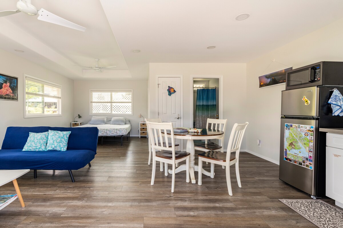 Please come and enjoy our quiet, clean, first floor unit. Sit and relax on the covered lanai, or enjoy a glass of wine by the fire. Listen while the coquis lull you to sleep at night and gently awaken to the cacophony of tropical birds in the morning. The downstairs unit at J&R's Banana Cabana offers a comfortable queen sized bed, kitchenette with microwave and refrigerator, and a full private bathroom. Come stay, enjoy, and relax!