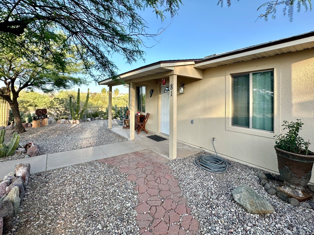 街尾簡單安靜的小房子,步行即可抵達歷史悠久的城鎮廣場,距離美麗的索諾蘭沙漠(Sonoran desert)僅幾分鐘路程。 房子設備精良,可供房客入住,您只需購買雜貨即可安靜地前往沙漠。這是我們的客用住房,毗鄰我們的主屋,這是一個共用的院子,也有足夠的空間供您的狗使用。我們是一個對狗友好的房源,我們有安靜的狗共用院子。我們有戶外座位、照明和火坑可供使用