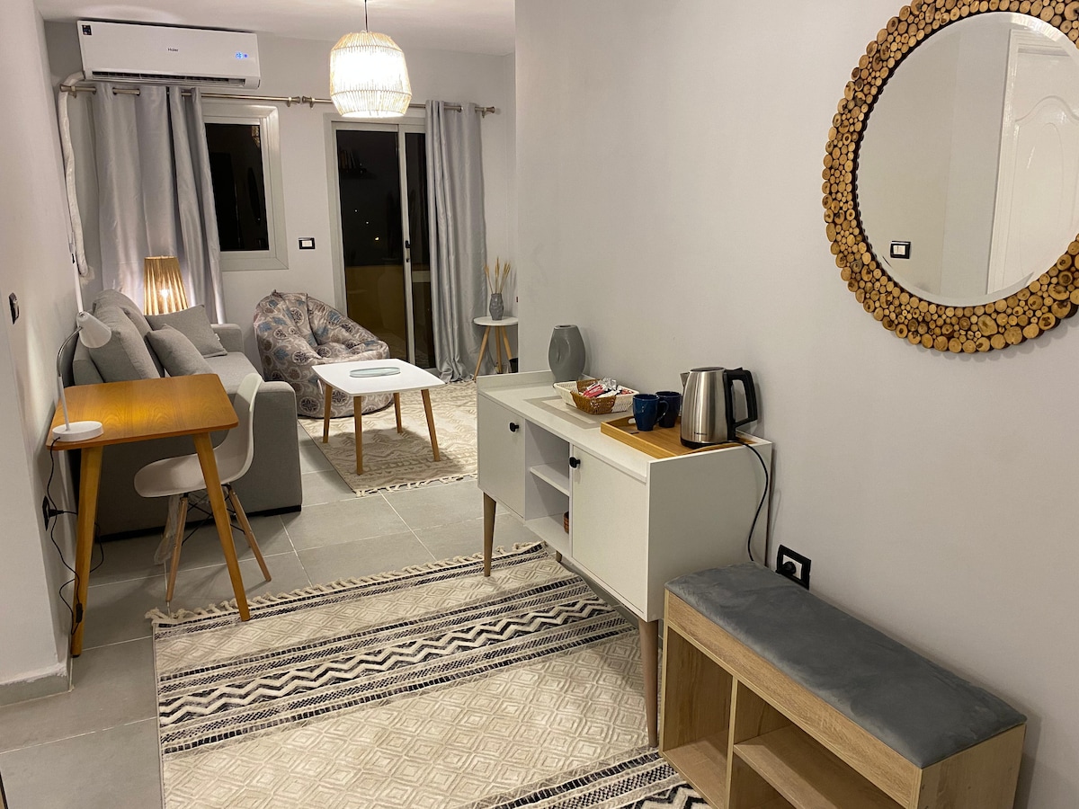 Experience the ultimate in modern comfort in our new 2-bedroom and 2-bathroom apartment suitable for 4 persons,Every inch of this stylish space is new and designed to make your stay unforgettable Our apartment is perfect for families or a business trip. You’ll find all the amenities you need, including a fully equipped kitchen, a comfortable living area Located in a prime compund, you’re just a short way from restaurants,shops in tagamoa and naser city Book now,,We can’t wait to host you!