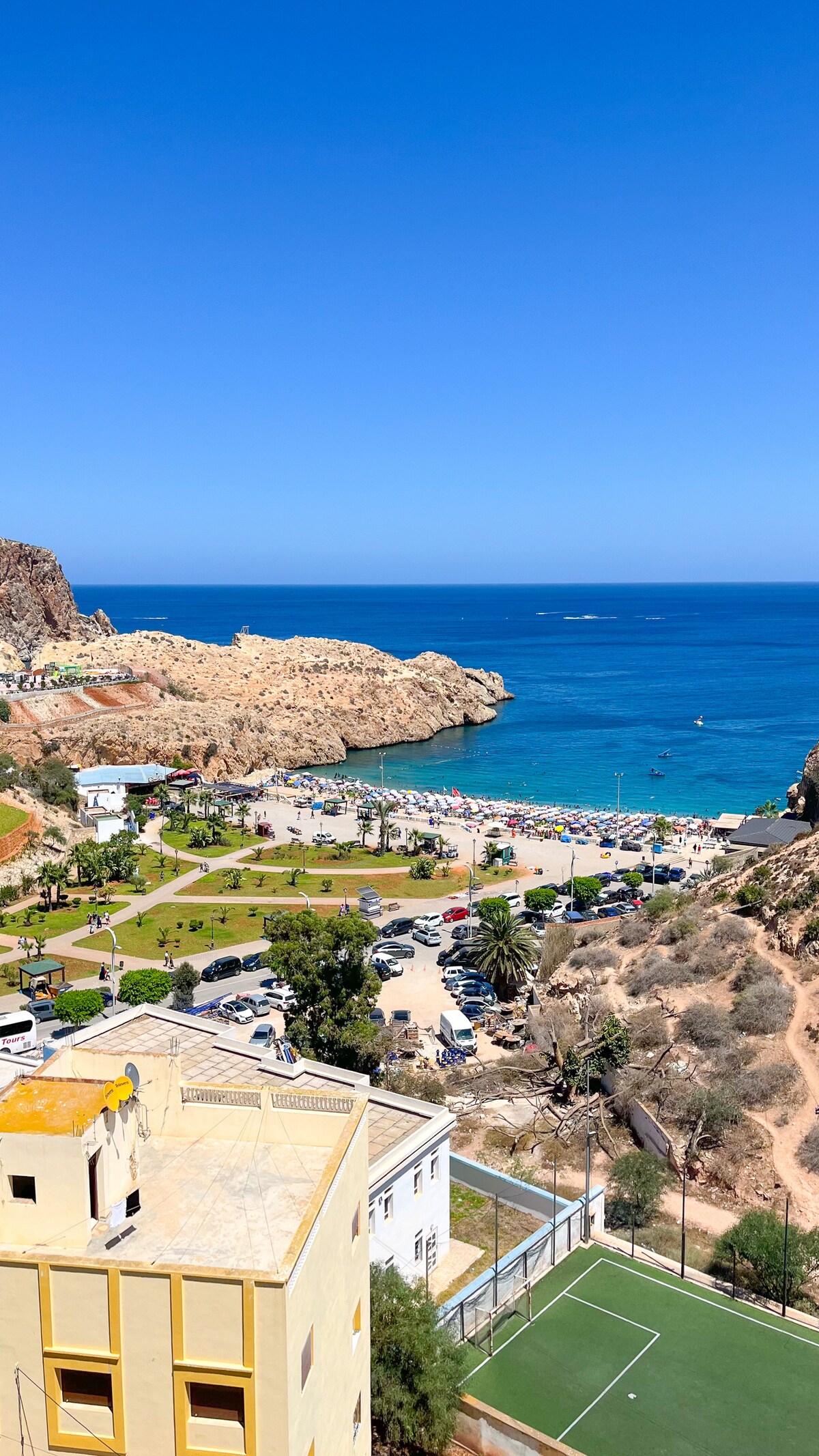 Penthouse met zeezicht Geniet van een ontspannen gezinsverblijf aan de kust met uitzicht op het Sfiha-eiland , direct zichtbaar vanuit je bed. Ontspan op het terras met een kop koffie of bewonder ’s avonds de sterrenhemel boven zee. De woning beschikt over ingebouwde airco, een moderne keuken, snelle wifi, tv met internationale zenders en een privéparkeergarage met lift. Gelegen in het rustige Igar Azougagh, vlak bij het strand – perfect voor gezinnen die comfort en rust zoeken aan zee.