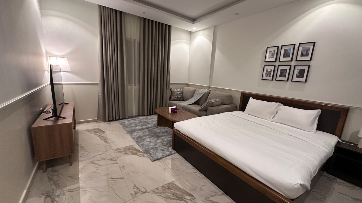 豪華主套房公寓包括: • 舒適的主床,確保您睡個好覺。 • 帶舒適沙發的優雅休息區。 • 高清電視,享受觀看。 • 配備咖啡角,可準備熱飲。 • 設備齊全的廚房。 • 私人浴室,配備洗髮精、香皂和沐浴露等所有必需品,讓您完全放鬆。 附近的地方: 距離聖殿清真寺不到 10 分鐘 兩聖寺火車站不到 10 分鐘 穆罕默德·本·阿卜杜勒-阿齊茲親王國際機場不到 15 分鐘