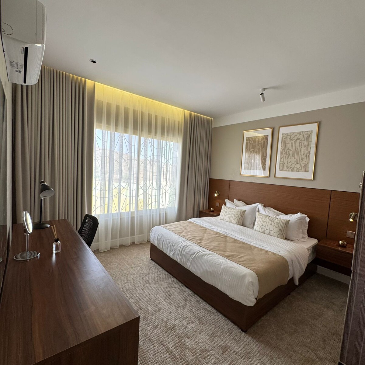 歡迎來到這間優雅奢華的房間,每個角落都兼具優雅和舒適,為一晚或更長時間的住宿提供完美的住宿體驗,舒適的雙人床,床下的燈光增添了一絲溫暖和美麗,大窗戶增添了極佳的自然光線,智能和大電視,分體式空調 房間設計風格恬靜舒適,採用米色和金色,並有溫暖的木質裝飾,燈光經過精心設計,適合各種時間:明亮的早晨或安靜的晚上,適合情侶、獨遊旅客甚至商務旅客。