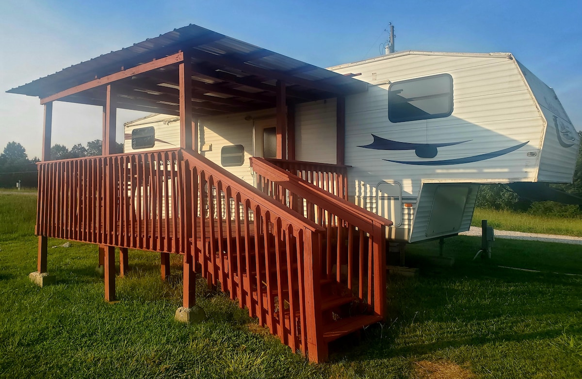 Enjoy a peaceful night away from the busyness of life on our farm. Our 34' camper has 1 bedroom with a queen size bed, full bath, full kitchen, living area with a loveseat and a futon that folds to a full size bed, table that seats 4, a TV and dvd player. With your own deck facing west towards the pond you can enjoy beautiful sunsets and the sounds of our animals around you. Please note that there is no wifi or cable tv in the getaway. So far everyone has had good cell signal.