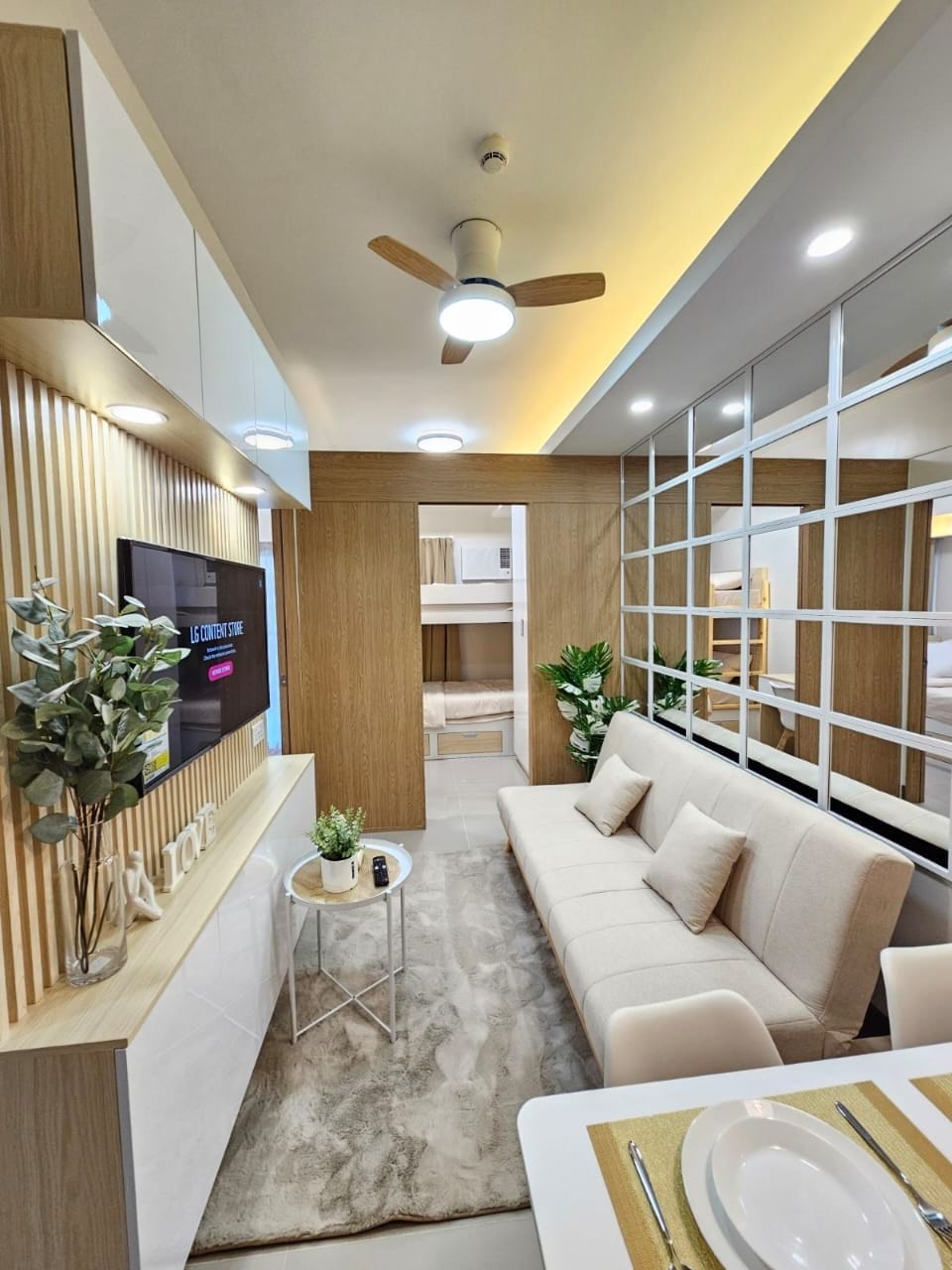 在這間時尚、明亮的單間公寓中體驗現代奢華。 它完美地優化了舒適度,配有豪華的全雙人床、舒適的沙發和55英寸4K電視下的時尚工作空間。 就在SM Southmall對面,滿足您的用餐、購物和娛樂需求。 摘要 優雅設計:令人驚嘆的水晶吊燈,搭配風扇和金色裝飾。 設備齊全:小型廚房,配有微波爐、冰箱和爐灶。 極致舒適:鏡面櫃門、遮光窗簾和冷氣。
