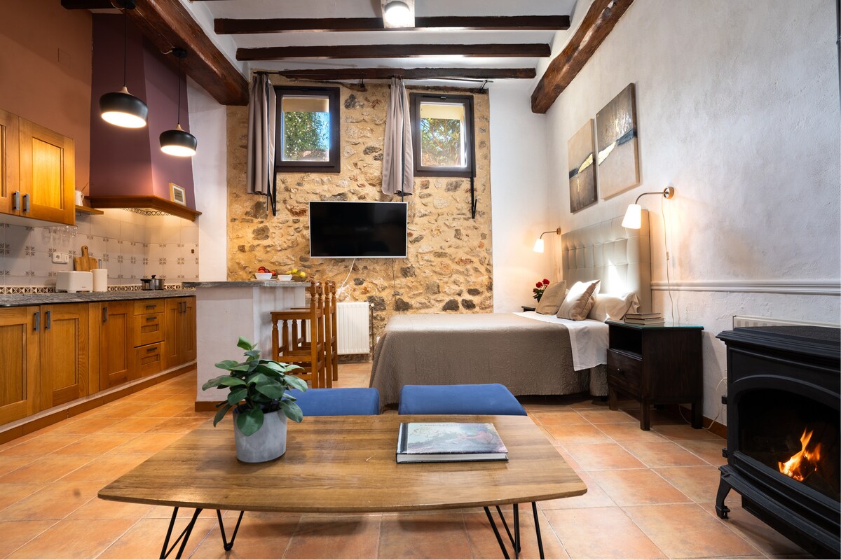 Vive tu escapada romántica en un loft rústico lleno de personalidad. Este acogedor loft, ubicado en la planta baja de una casa tradicional, combina el encanto de lo rural con todas las comodidades modernas. Destaca de este apartamento su alto techo, sus gruesos muros de piedra y una chimenea ideal para invierno. La cocina totalmente equipada se encuentra integrada en el salón. Un lugar con alma, creado para disfrutar con pareja o familia, rodeado de tranquilidad y autenticidad.