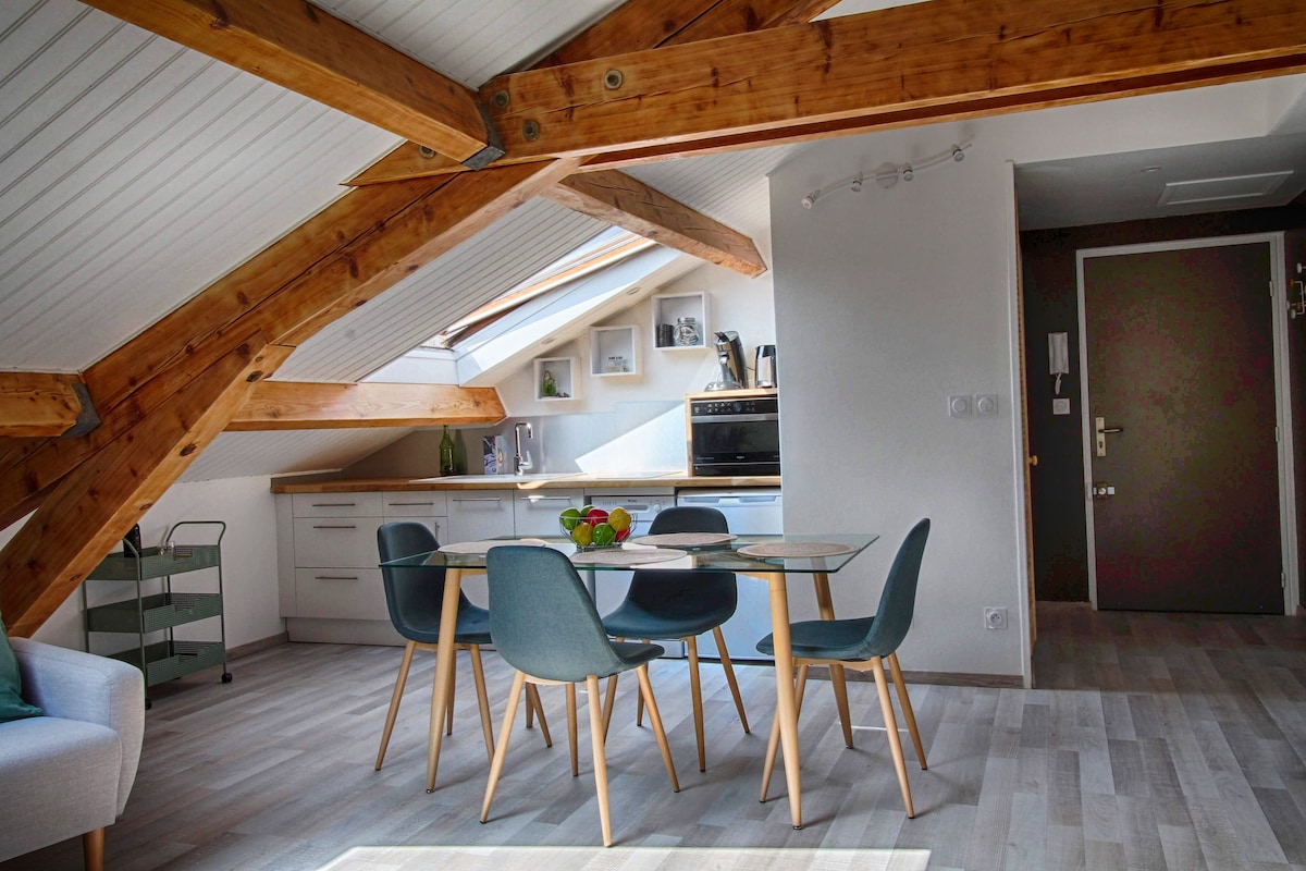 Joli appartement sous les toits, très lumineux, climatisation, entièrement rénové au goût du jour, confortable et plein de charme, vous êtes à deux pas du centre ville "la Bastide" et de la Cité médiévale , en quelques minutes à pied. Situé au 4ème étage d'un immeuble récent, ascenseur jusqu'au 3ème. Cuisine bien équipée, douche italienne, laverie automatique au pied de l'immeuble. Possibilité garage privé, voir règlement intérieur. Wifi offert
