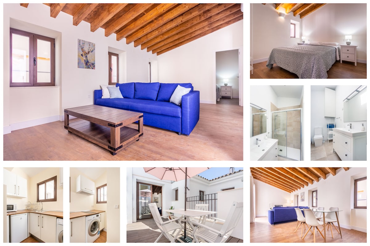 Beautifully restored townhouse converted into a modern vacation rental celebrates the old building structure with warm modern interiors and a touch of industrial style. Floor-to-ceiling, French windows look out over traditional balconies on to the charming street below. Sunlight floods the open plan space, casting light on exposed sandstone walls and illuminating the stunning oak beam ceilings. The shared top floor terrace offers incredible views to the Cathedral roof and the Giralda.