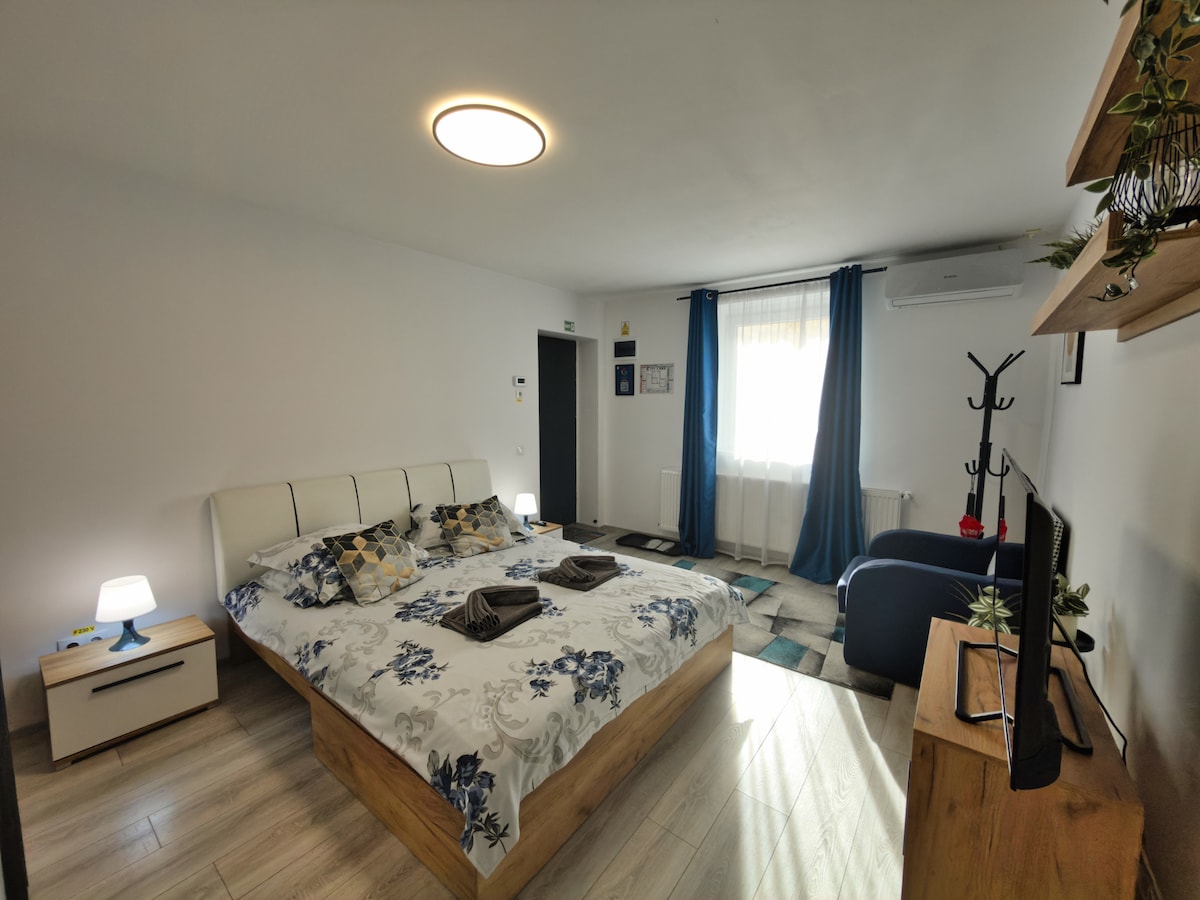 Discover your modern studio retreat in Sibiu! Perfect for a single person or a couple , this ground-floor apartment offers a quiet escape just a 15-20 minute walk from the historic center. Enjoy A/C, high-speed internet, a fully equipped kitchen, and a smart TV. Experience the perfect blend of comfort and convenience in a peaceful residential neighbourhood.