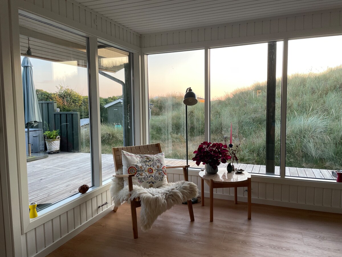 這座120平方米的獨特度假屋距離波濤洶湧的北海僅幾分鐘步行路程,隱藏在高高的沙丘中,從道路上只能隱約看到。在最高的沙丘上,有一張長凳,可以欣賞大海和日落的美景。您可以在那裡喝杯咖啡或葡萄酒。 開車前往海濱小鎮Blokhus僅11公里,距離Løkken僅15公里,步行或騎自行車通過該地區的小徑更短。此外,如果您喜歡騎山地自行車或徒步旅行,這是一個很棒的區域。