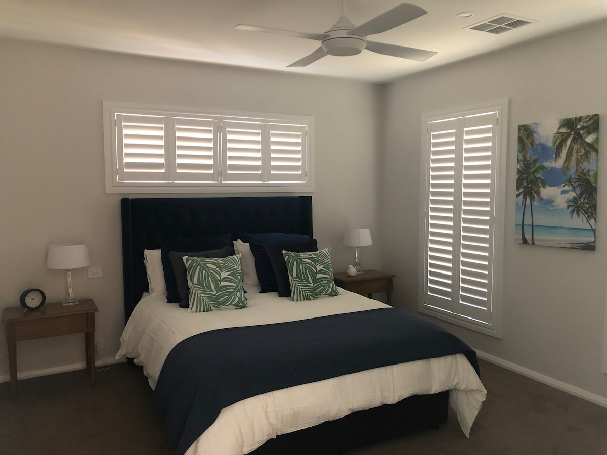 我在奧爾伯里的房源是一個華麗、新建的現代房源,供您享受。房源設有3間臥室,均配有雙人床,最多可入住6人。主臥室有步入式衣櫃和套房。其他臥室均設有內置浴袍。廚房設備齊全,休息室配有智慧電視、用餐區和迷人的室外露臺區域。開車5分鐘即可抵達城鎮和當地景點。前往Beechworth、Rutherglen、Hume Weir、Snowfields和周圍地區都很方便。