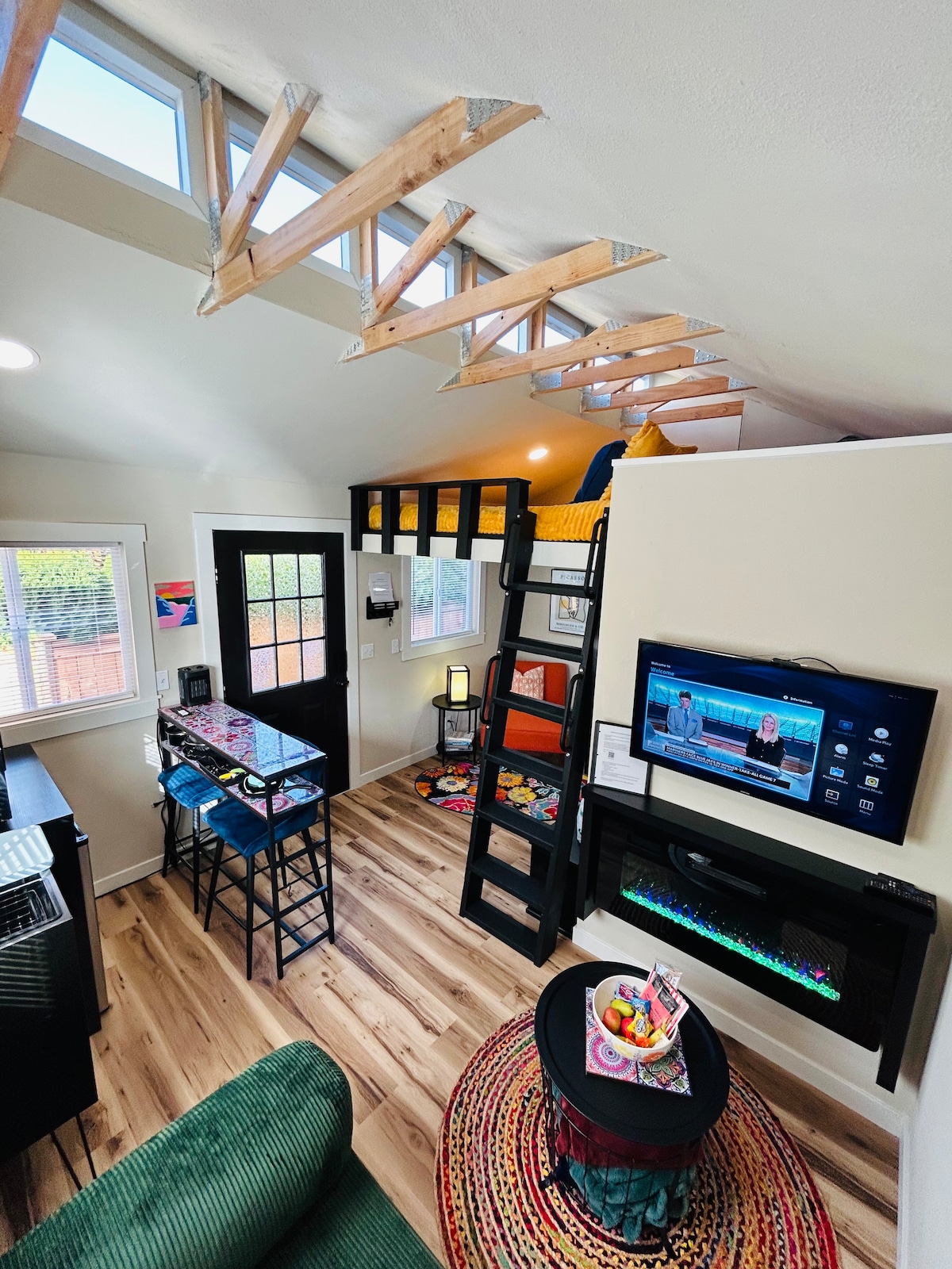 Drive down past our farm amongst the trees & wildlife. Adventure awaits in this beautiful nordic tiny cabin we curated for you to enjoy . Enjoy & gather eggs from the hens, eat from the garden, s'mores, swing on the swings, play games, records, & open the wall to wall front glass doors, wood fired hot tub & watch the sea of trees move in the wind on the porch. 15min -Tacoma/13 min - Puyallup fair/45min to airport and Mt. Rainier. + on adventures in listing photos. @theevergreentinycabin