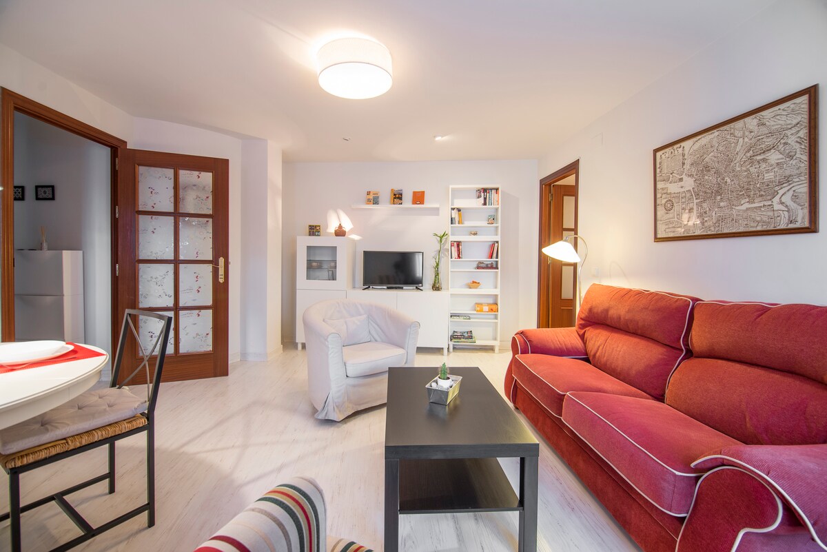 舒適、通風和舒適的兩房公寓,有四個陽臺,可俯瞰步行街,步行10分鐘即可抵達La Alhambra ,離Alhambra森林( El bosque de la Alhambra ) 設備齊全的廚房可讓您在不想外出用餐時準備餐點。 您也可以在洗衣機和烘乾機組合中洗衣服。 客廳/餐廳組合,配有舒適的沙發、圓桌和電視……在漫長的一天觀光後,這裡是放鬆身心的理想選擇。
