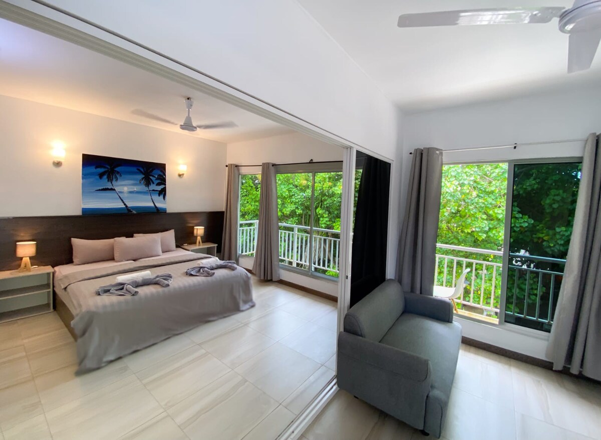 在我們時尚的豪華客房中放鬆身心,客房配有舒適的特大床、現代化設施和俯瞰茂密熱帶綠色植物的私人陽台。 享受清新的海島微風、充足的自然光線和寧靜的氛圍,在海灘度過一天後放鬆身心。 非常適合在Thoddoo住宿期間尋求舒適和自然氣息的情侶或小家庭。