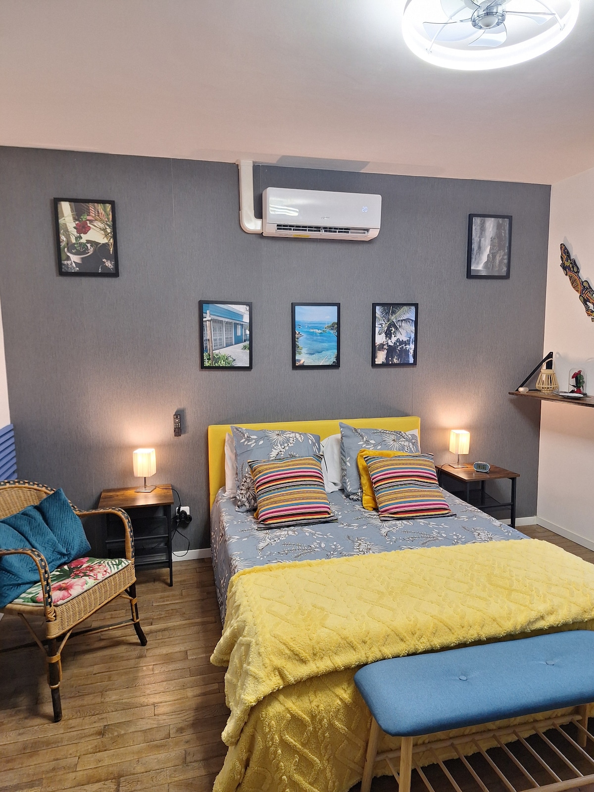 Vous adorerez le décor dépaysant de cette chambre climatisee donnant sur le jardin dotée d'un lit en 140, et à laquelle nous pouvons rajouter un lit d appoint ( avec un supplément ) si besoin. ou un lit parapluie.un frigo top et une bouilloire avec quelques dosettes seront à votre disposition ainsi qu un barbecue si le temps le permet. un petit déjeuner continental vous sera également servi dans notre salle à manger ou en terrasse suivant le temps.