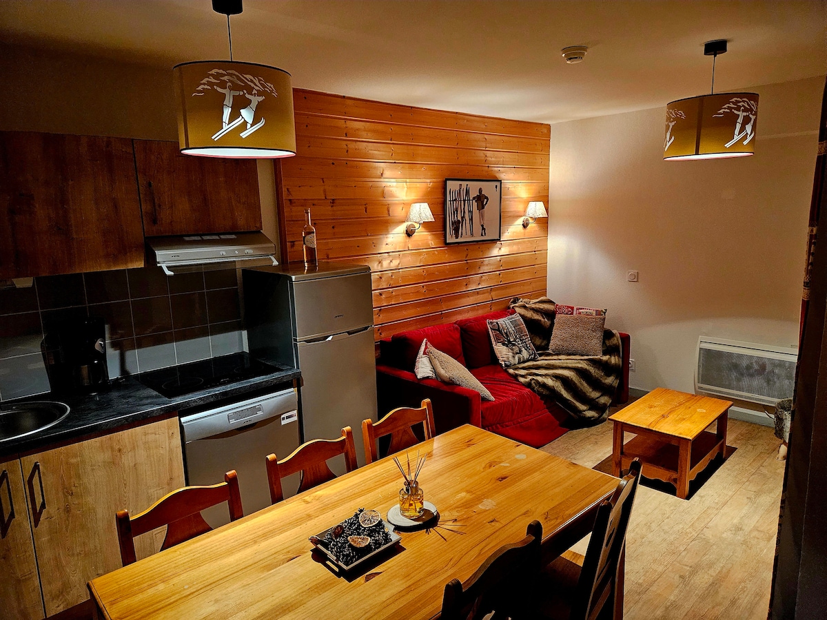優雅的公寓(36 平方公尺,夾層有 9 平方公尺的雙人床),可容納 4 人。位於度假村中心安靜區域的一棟小型建築的二樓和頂樓,距離商店、游泳池、溜冰場和體育宮僅 2 分鐘路程。 配備齊全的大小家電、床單和毛巾,美麗的朝南陽台。WiFi、私人停車位、許多儲物空間、滑雪用具儲物櫃。步行 5 分鐘即可到達滑雪道。