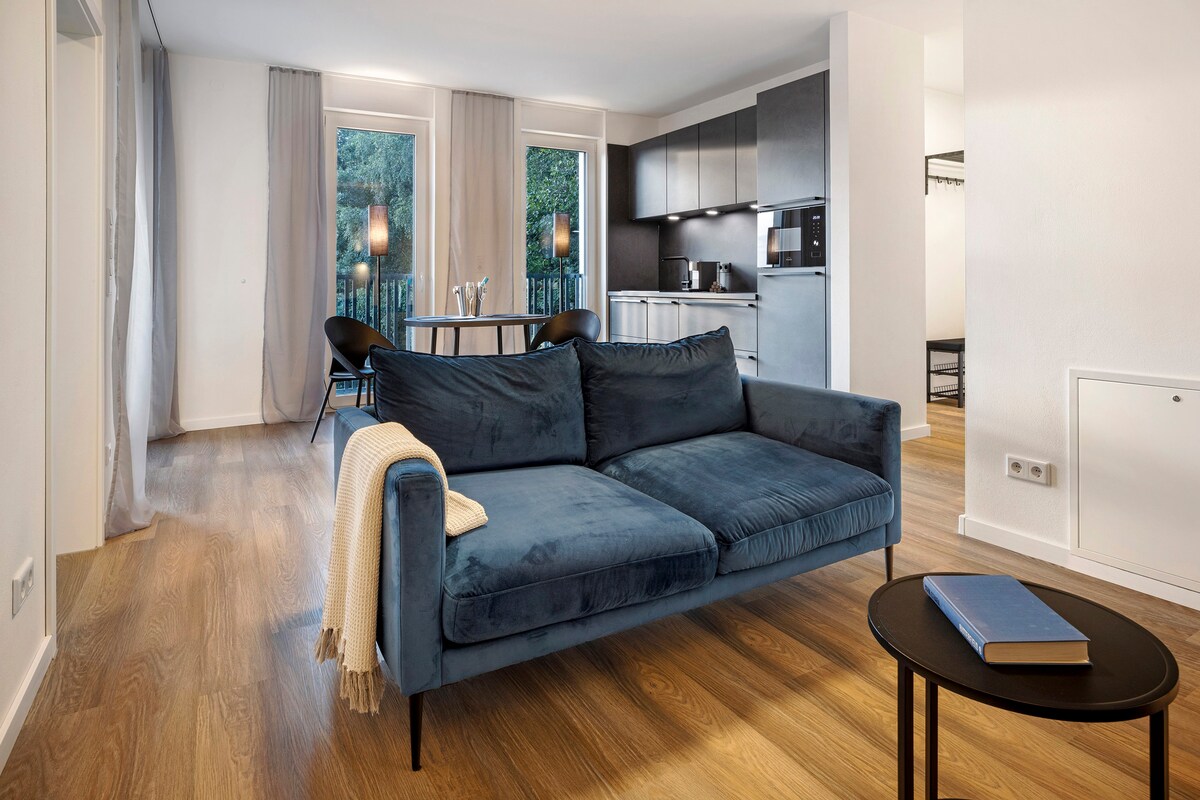 The "Egge Resort 7f" holiday apartment, set on a hillside in Altenbeken, offers 48 m² of space for up to two guests. It features a living-dining area, a fully equipped kitchenette, a separate bedroom, and a bathroom. The kitchenette includes a dishwasher, microwave, fridge with small freezer, double hob, kettle, toaster, and Philips Senseo coffee machine. Bed linen, a dish towel, two sauna towels, two XL bathrobes, two large, two medium, two small towels, and three bath mats are provided.