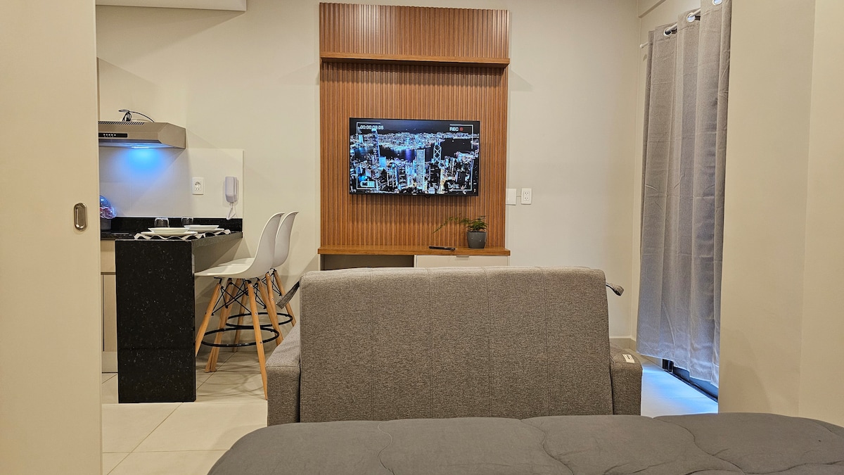 Bienvenidos a una experiencia única en el mejor punto de la ciudad. 🛏️ Dormitorio: Cama de alta calidad, iluminación acogedora y diseño moderno. 🛋️ Sala de estar: Sofá cómodo, Smart TV con acceso a plataformas de streaming y grandes ventanales que llenan el espacio de luz natural. 🍽️ Cocina totalmente equipada para cocinar como en casa. 🛁 Baño completo: Ducha con agua caliente, toallas suaves y artículos esenciales de higiene.