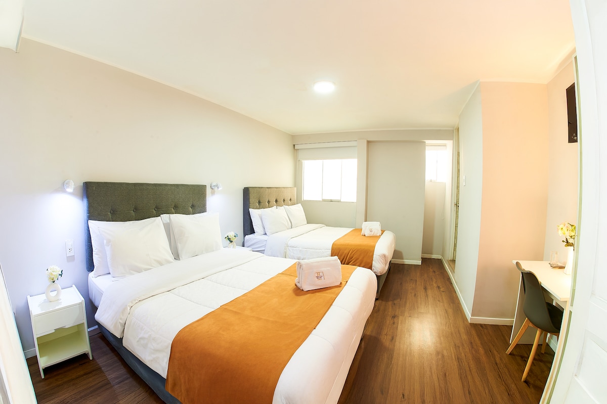 Habitaciones con cama grande y baño privado en hotel, ubicada en avenida principal de Arequipa. Cerca de centros comerciales, restaurantes, bancos, además de la Plaza de Cayma y Yanahuara. Ideal para parejas que buscan privacidad, comodidad y fácil acceso a la ciudad. Como complemento, también ofrecemos habitaciones con cama doble, perfectas para viajes familiares o grupos que deseen compartir estancia en un mismo lugar.