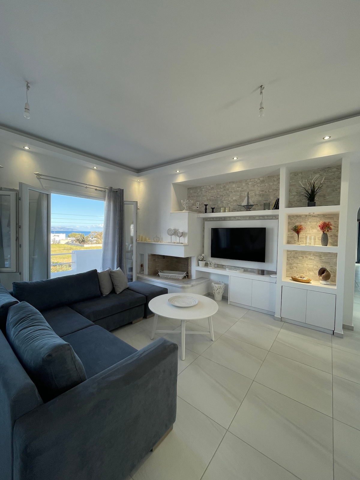 這間令人驚嘆的二樓兩間臥室海灘前公寓位於Naousa的Ambelas海灘,擁有愛琴海的所有美景。 海風海濱公寓(seabreeze seafront)非常適合家庭或朋友入住,從寬敞的陽臺俯瞰純淨的藍色大海,為日落時分的晚餐或早晨的休閒時光創造理想的風景。 地理位置優越,開車10分鐘即可抵達Naoussa村(夜生活、商店),步行3分鐘即可抵達島上最優雅的海灘酒吧之一。