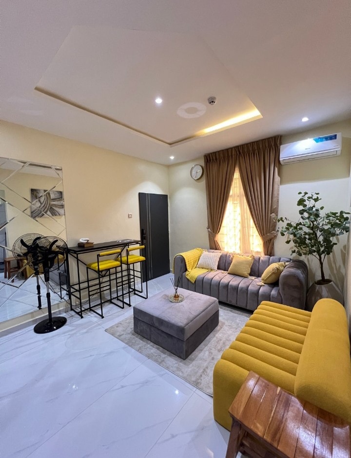 在拉各斯Okota這間設計雅緻的3BDR公寓中,讓您有賓至如歸的感覺。 這間現代化的空間非常適合短期和長期住宿,設有冷氣臥室、配備高級設施的套房浴室,以及適合工作或休閒的時尚客廳。 使用 Starlink WiFi 保持連線、在智能電視上串流您最喜愛的節目,或在廚房準備餐點。 位於安靜的社區,設有24小時保安和不間斷的電力,您將享受私隱和安寧。