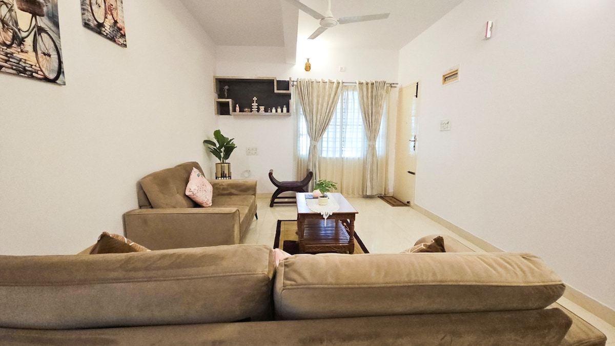 ✨陽光充足、優雅的4BHK,四周綠意盎然,非常適合家庭、朋友或商務旅行。 享受別緻的室內裝潢、65英寸智能電視(配備Netflix )、快速Wi-Fi、備用電源和有趣的桌上足球/棋盤遊戲角落。 在陽台品嚐咖啡,在設備齊全的廚房烹飪,並在寬敞、平靜的臥室放鬆身心。 ⚠️ 僅限安靜入住:禁止舉辦派對或播放吵雜的音樂;晚上10點後請保持安靜。