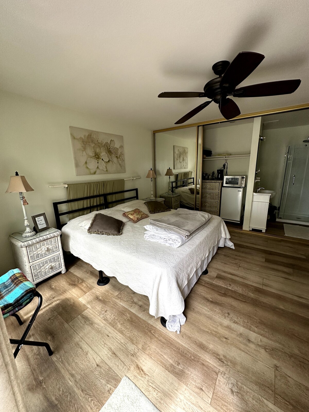 約650平方英尺 單間公寓。舒適的加大雙人牀。 可舒適入住2人,可選擇接待第3位旅人,由你決定。 充足的衣櫃空間。智能電視,讓您可以登入您最喜愛的電視應用程式。 開放式概念臥室/客廳的沙發、咖啡桌和梳妝臺。 全套廚房。快速WiFi。 公寓內免費洗衣機/烘乾機(洗衣精)。 配備製冰機的冰箱。 玻璃水壺火鍋(速溶咖啡)。 完全消毒和清潔。 這並非共用空間。 享受