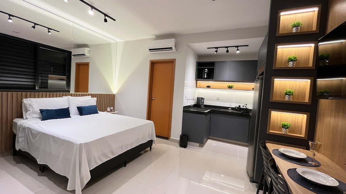 優雅舒適的Loft ,位置優越。 我們的公寓完全自動化,公共區域、電梯、旋轉車庫包含熔巖和乾旱,距離UniEvangélica 500公尺,距離Anima醫院600公尺,距離HUANA醫院750公尺。 公寓包括: Cama casal 空調 智慧電視 爐竈 電烤箱 科伊法(Coifa) °微波爐; Geladeira 攪拌機 保溫瓶 Sanduicheira 攪拌機 Plratos 餐具 Meat Tábua ・鍋具 肉刀 牀上用品和浴室用品