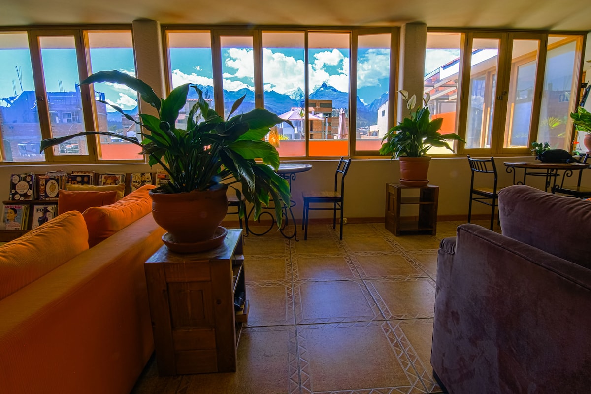 漂亮整潔整潔的房間,熱水淋浴。 非常適合祕魯。 友善的員工。可以訂購額外的早餐。 美麗愉快的露臺。我們在瓦拉斯10000英尺處,所以我們的第一天很艱難。 在這裡放鬆身心很方便 我們的所有房間都是套房。 寬敞的房間,被子。 免費WIFI網路 客廳和漂亮露臺 旅行社|山地自行車之旅