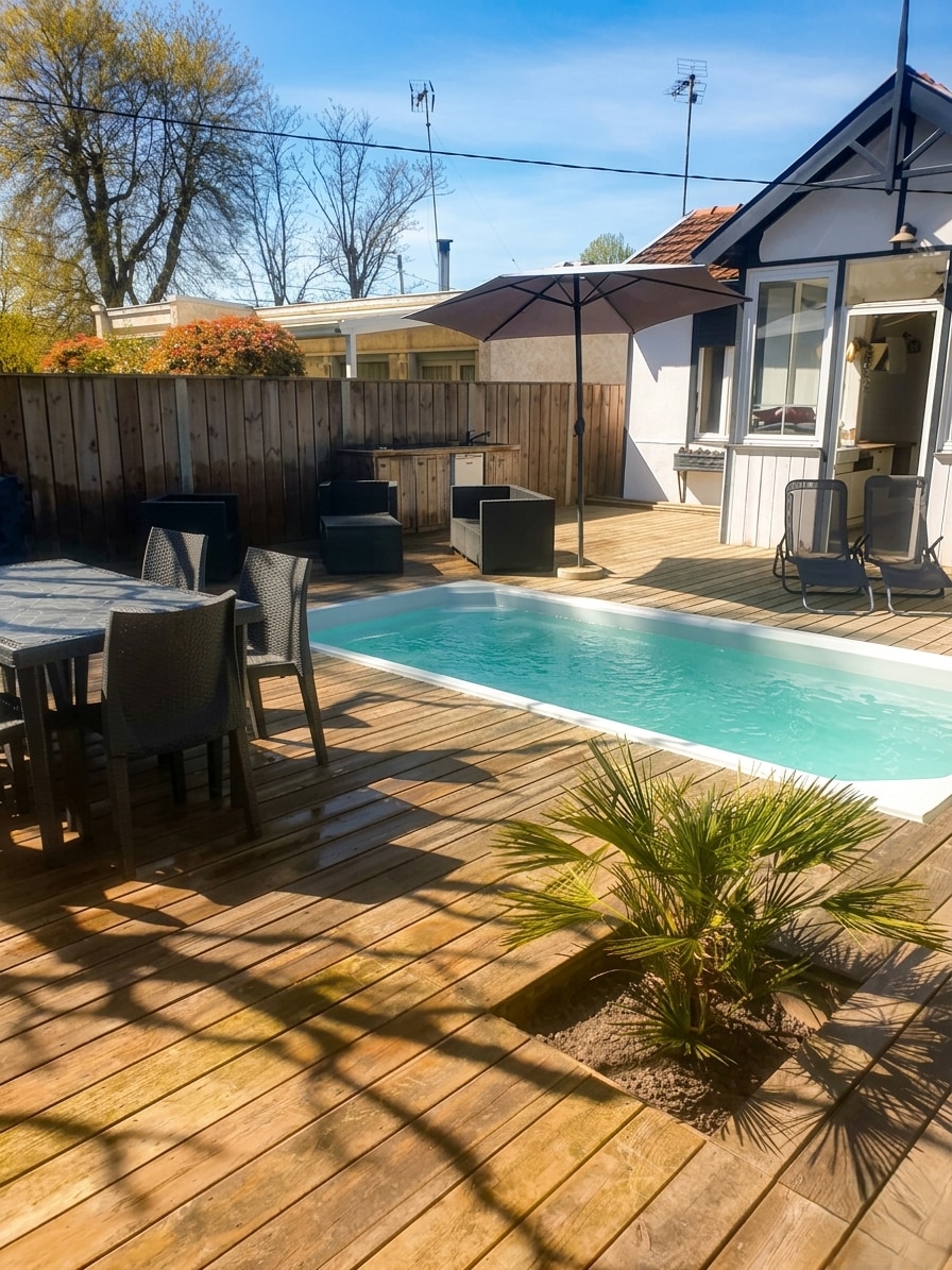 這是一棟全新的豪華家庭住宅,配備空調,採用經典的木造建築風格,是阿卡雄灣(Bassin d'Arcachon)的典型建築,提供特別精緻的服務,非常適合與家人或朋友一起入住。 坐落在 850 平方公尺的封閉式景觀花園中,環境安靜,距離海灘和阿雷斯 (Arès) 中心僅 3 分鐘路程,配有漂亮的泳池和躺椅、寬敞的有頂露臺、花園休息室、用餐區和烤肉架,讓您享受愉快的放鬆時光。