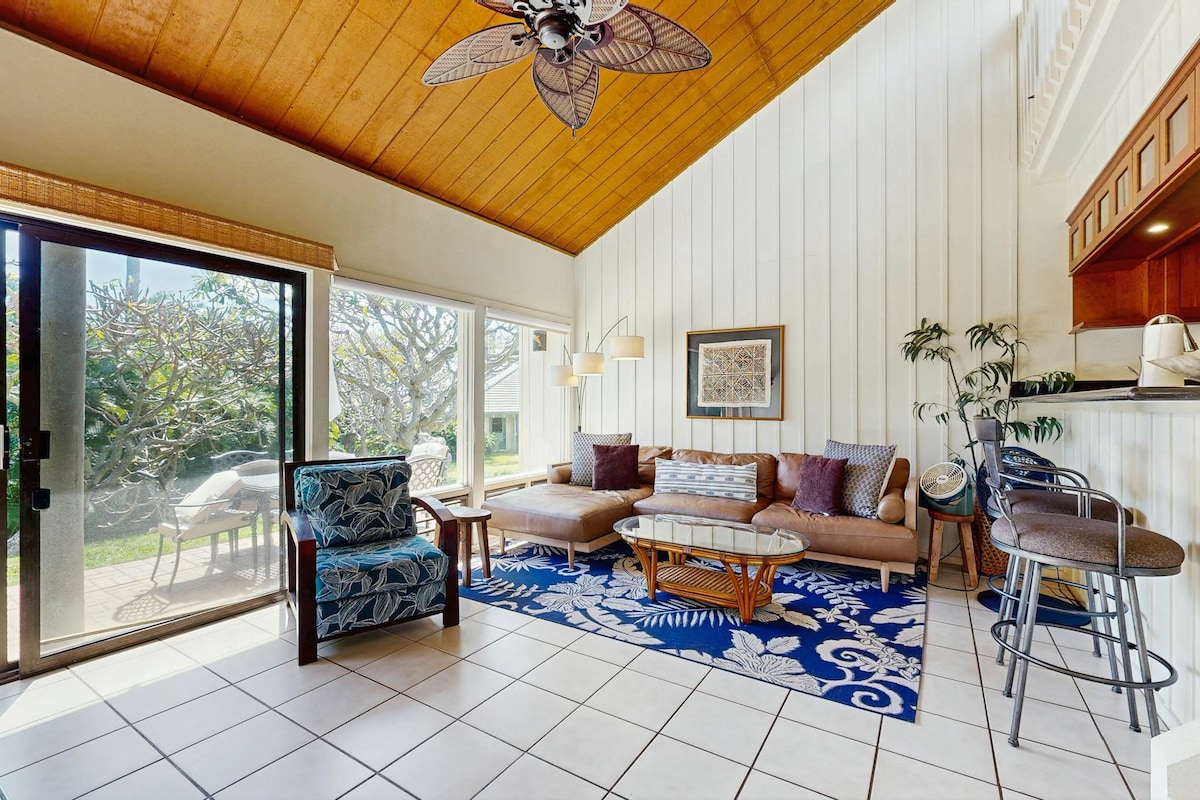 現在有空調 - 位於可愛島北岸的高尚、光線充足的平房式連棟房屋。享受安靜放鬆的陽台,四周環繞著郁郁葱葱的島嶼綠地,或在附近的泳池中暢泳。開放式起居空間和兩間臥室,配有獨立浴室和陽台。距離日出景觀和Wyllie Beach步道起點僅幾步之遙。 騎自行車前往皇后浴場(Queens Bath)、日落快樂時光、餐廳、購物和瑜伽。開車即可抵達哈納雷灣(Hanalei Bay)、阿尼尼海灘(Anini Beach)、隧道海灘(Tunnels Beach)和其他北岸瑰寶。