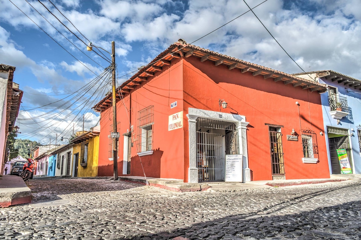 體驗入住危地馬拉安提瓜市中心的感覺。步行幾個街區即可抵達公園,漫步在這些神奇的街道上。 附近有許多餐廳、酒吧和景點,但距離足夠遠,讓我們免受夜間噪音的影響。 這是一個為 2 人設計的舒適空間,配備了在美麗且超級安全的街區長期和短期住宿所需的一切。 我們沒有私人停車位,您必須在抵達時爬幾階樓梯。