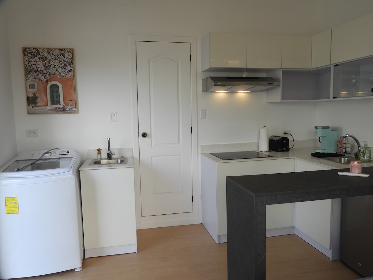 公寓般的Loft非常乾淨、開放、輕鬆、簡約和舒適,位於商場和餐廳附近的安全區域,可通往市區的重要大道。 備有全套廚房和配備品、客廳、舒適的加大雙人牀、衣櫃、配備辦公桌的工作區域和配備烘衣機和洗衣機的全套洗衣區域。 閣樓有電視、WiFi和2個停車位。 位於私人街區最安全的地區,全天候保安。