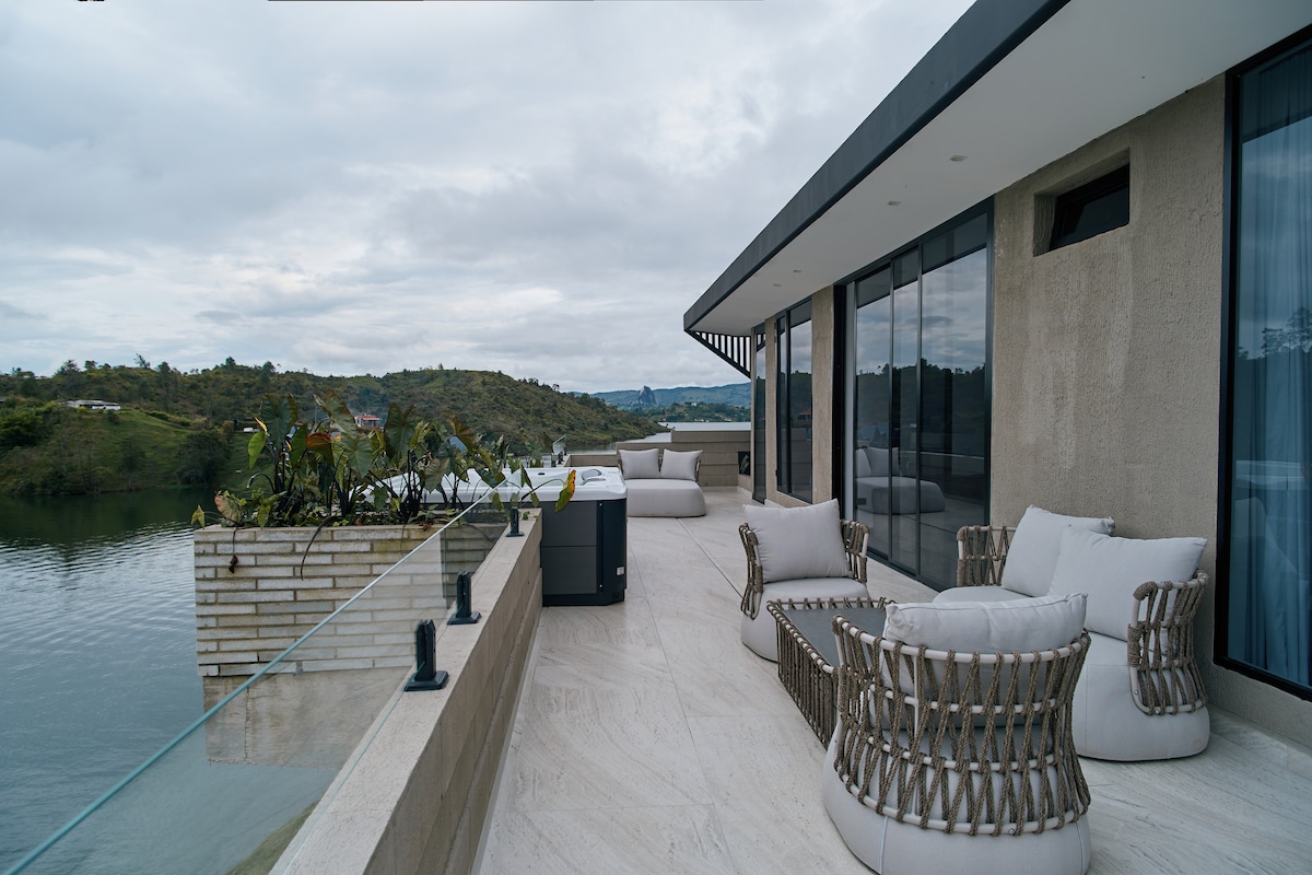 歡迎來到我們的浮動小屋!我們提供獨特而難忘的體驗,可欣賞令人驚嘆的水景和山景。我們的小屋配有舒適的床、獨立浴室、露台按摩浴缸和戶外運動皮艇,非常適合浪漫度假或獨自冒險 讓瓜塔佩水庫的魔力成為您的水上家園,探索一個寧靜與奢華融合的地方,為您提供獨一無二的生活體驗。