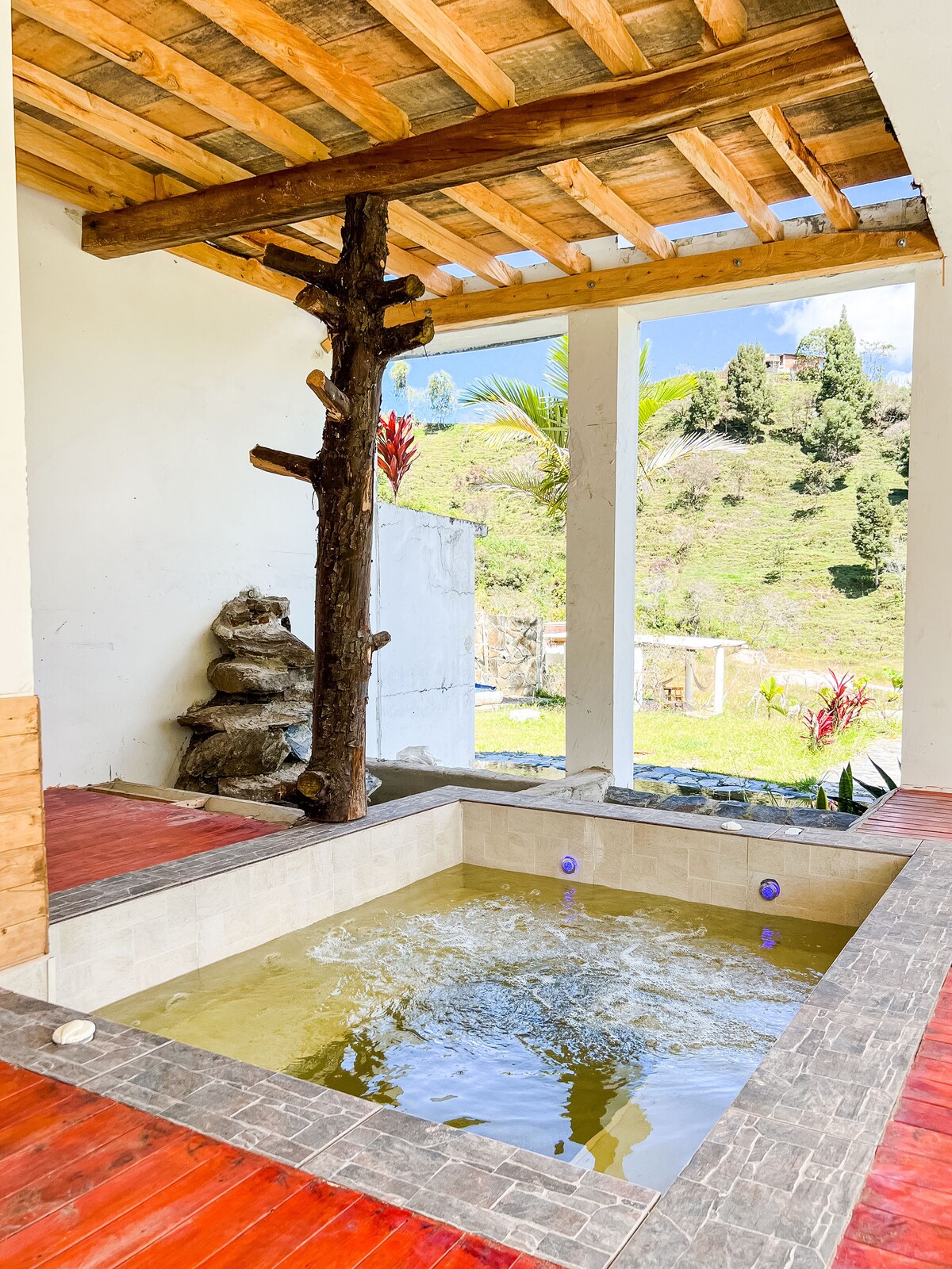 Casita de Madera配有室外按摩浴缸,配有投影機(不包括電腦)的閣樓、燒烤和消防區、陽臺、甲板、棋盤遊戲、Wi-Fi、廚房和私人停車場。 它距離José María Córdova de Rionegro機場15分鐘路程,距離麥德林30分鐘,距離Peñol石材40分鐘,距離Llanogrande 20分鐘,距離Guarne、Marinilla、Rionegro以及Antioquia東部的其他景點15分鐘路程。 它距離那不勒斯Hacienda 180公裏。