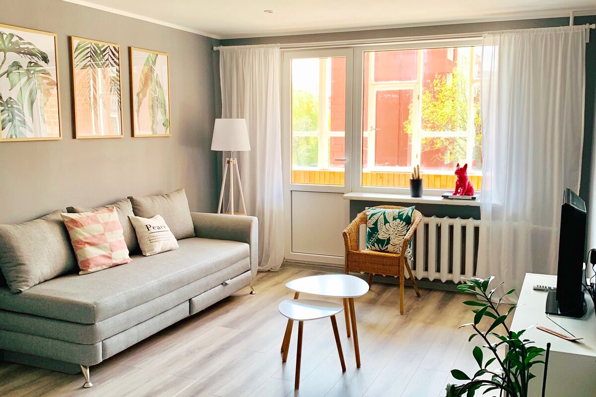 步行10分鐘即可抵達Anykščiai市中心,這套33平方公尺的公寓坐落在鬆林旁的安靜社區。 這間面向南方的單間公寓於2020年全面翻修,是情侶的舒適度假勝地。隨身攜帶式彈簧牀墊和衛星牀單讓您能夠好好休息,而設備齊全的廚房和烹飪必需品在您起牀後也很方便。 陽臺上的可折疊桌可讓您享用陽光明媚的午餐或浪漫的夜晚。