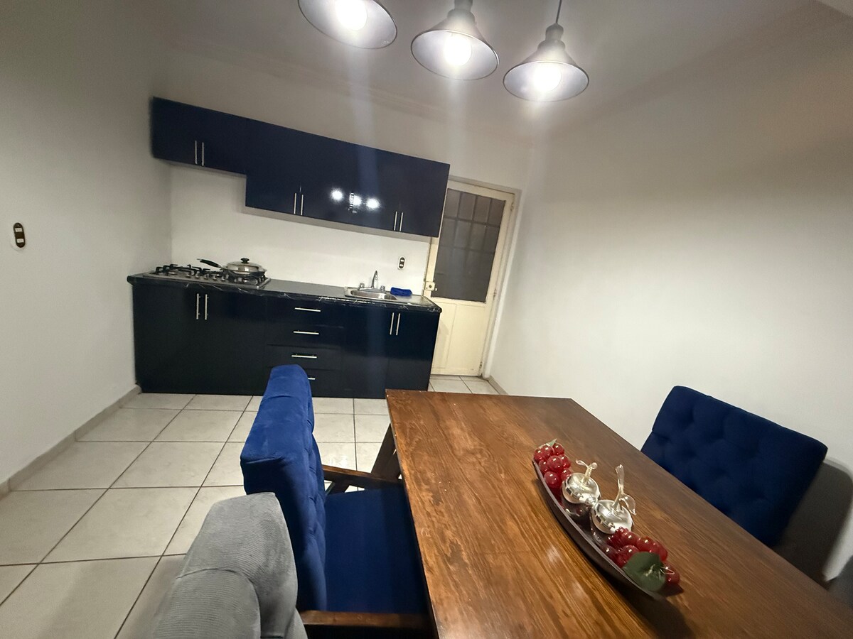 舒適的公寓,配有所有服務和設施。 非常適合休息、開會、聚會或派對。 全新改造,非常乾淨。 兩張標準雙人牀、洗衣空間、微波爐、配備餐具和廚房傢俱的廚房。 適合兒童、團體等。 可停放2或3輛車的停車位。 這間公寓感覺像在家一樣。 包括所有服務。設備比飯店更好。 附近有Bancomer自動取款機、肯德基、玉米餅店和聯邦高速公路。 位於市區入口處