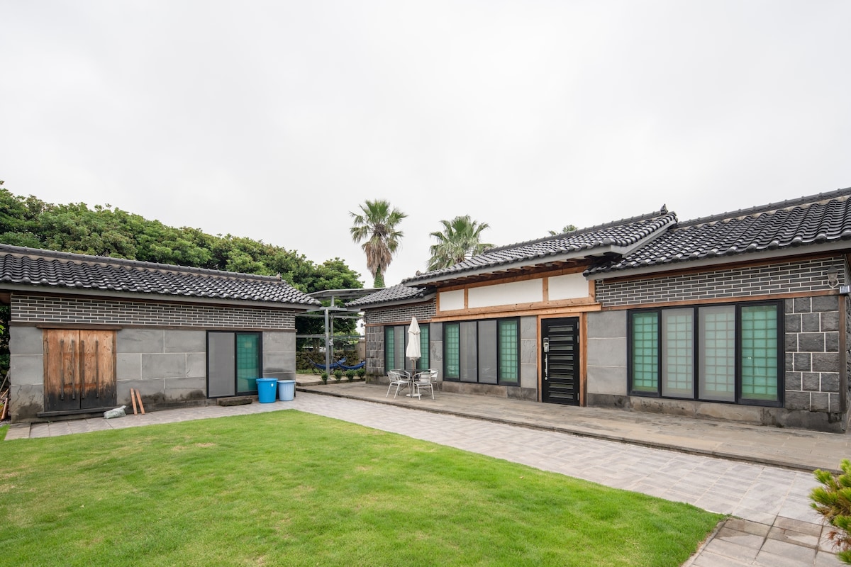 裕家轩是一座位于濟州机场附近的老虎形屋,坐落在诺亨洞。主屋和附房呈“ㄱ”形排列,中间有一个被济州石墙环绕的美丽花园。客人可以使用整个主屋,而附房则偶尔由房东用于花园维护和清洁。 主屋有着高高的屋架,内部使用红松木建造,让客人能够尽情感受传统老虎形屋的美。花园里有柿子树、榅子树和冬青等果树,秋天时结满了丰硕的果实,还有一个适合孩子们玩耍的草坪。 早晨醒来时,可以听到鸟鸣,眺望庭院,享用愉快的早餐。有时,甚至会有野鸡光临。