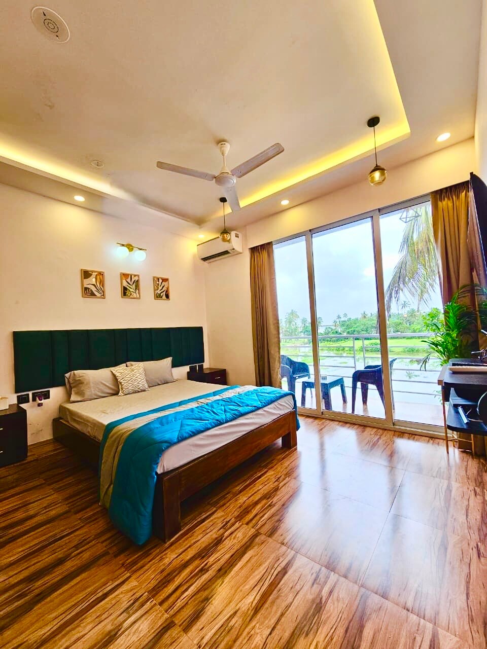 Cute & Cozy Riverside Studio in Siolim, Goa This charming yet spacious studio is centrally located in Siolim, right next to the river, and just a 13-minute drive to the sandy shores of Morjim Beach. Grocery stores and restaurants are only a 5-minute walk away for your daily needs. Popular spots like Thalassa, Kiki by the sea and other well-known party venues are only a 10-minute drive, making it perfect for guests who want to enjoy both calm mornings and lively evenings.
