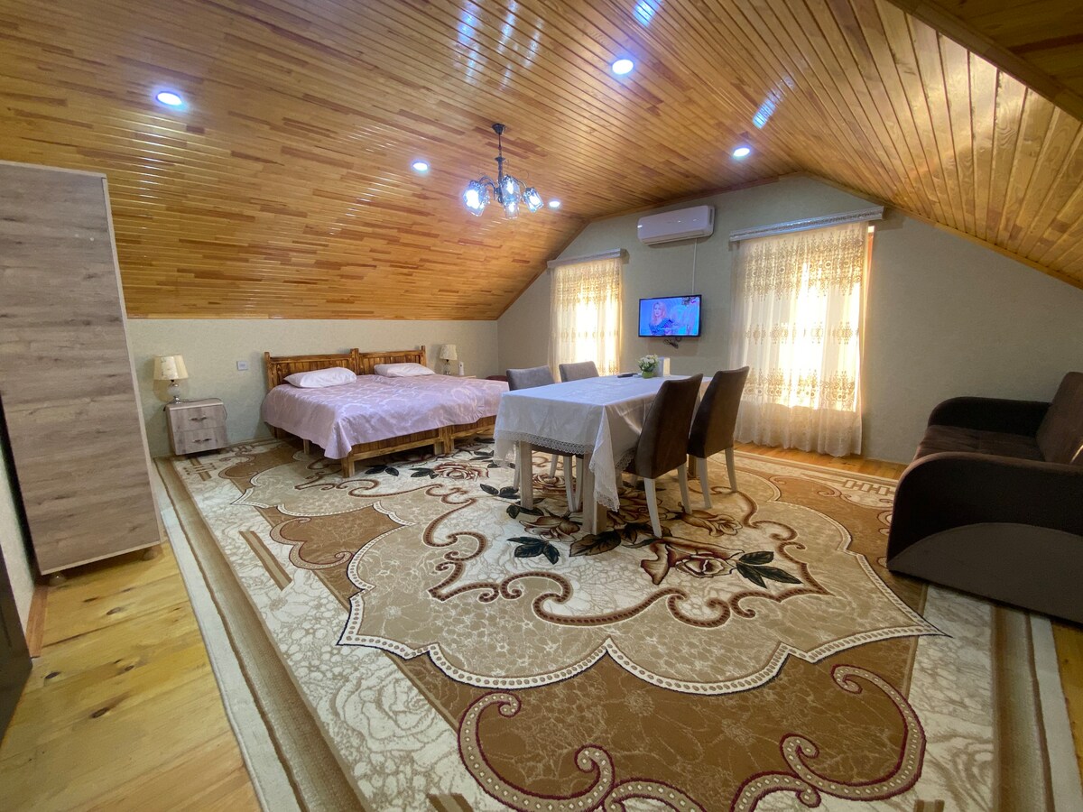 房子位於市中心,步行兩分鐘內即可抵達農夫集市,步行10分鐘即可抵達Kura河和其他城市景點。 步行1分鐘即可抵達公共交通工具。 房子有經典家具的房間和漂亮的院子。 客房內設有免費WiFi。 最近的國際機場是加巴拉國際機場一小時車程。 Sheki和Ganja城市距離開車不到40分鐘。