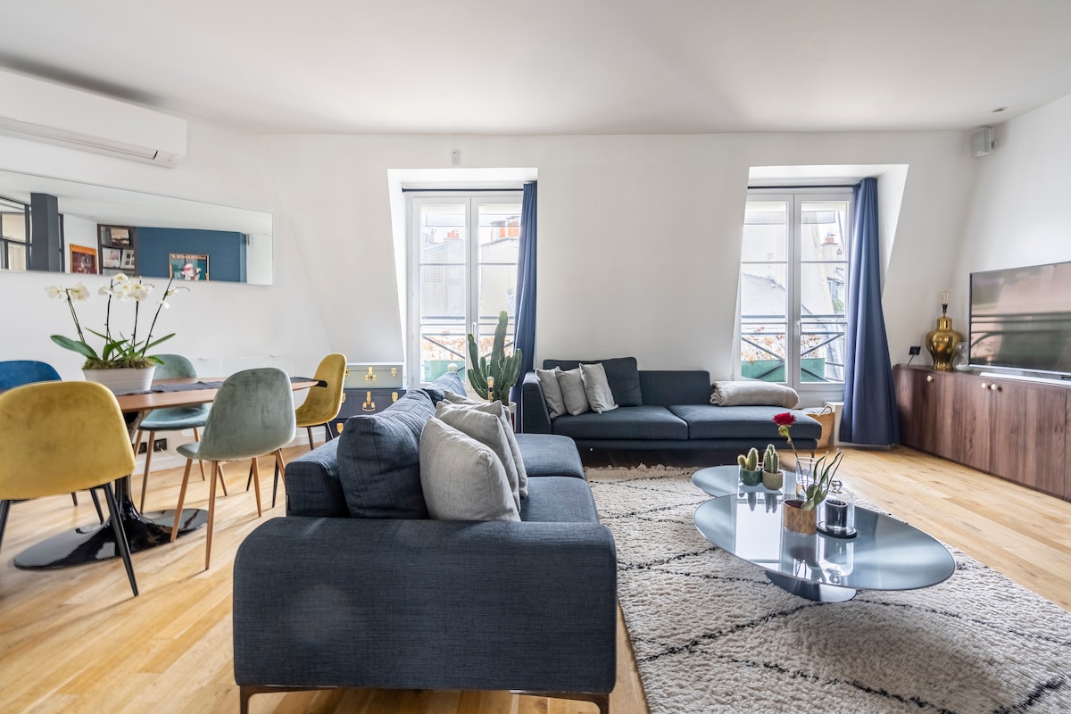 Above the rooftops of Paris, on Montmartre hill, for romantics visiting the city. Built in 1885, a 57m² (614 sf) duplex, on the 5th floor, no elevator--but the FAIRYTALE VIEW makes up for it! Unique, sunny, original parisian apartment. Tastefully and comfortably furnished. On a quiet side street, you'll sleep very well. ★Enjoy the real live of a Parisian from Montmartre! ★Sacré-Coeur Basilica - 8 min' away, ★Amelie Poulain’s Café, ★Moulin Rouge - 5 min'.
