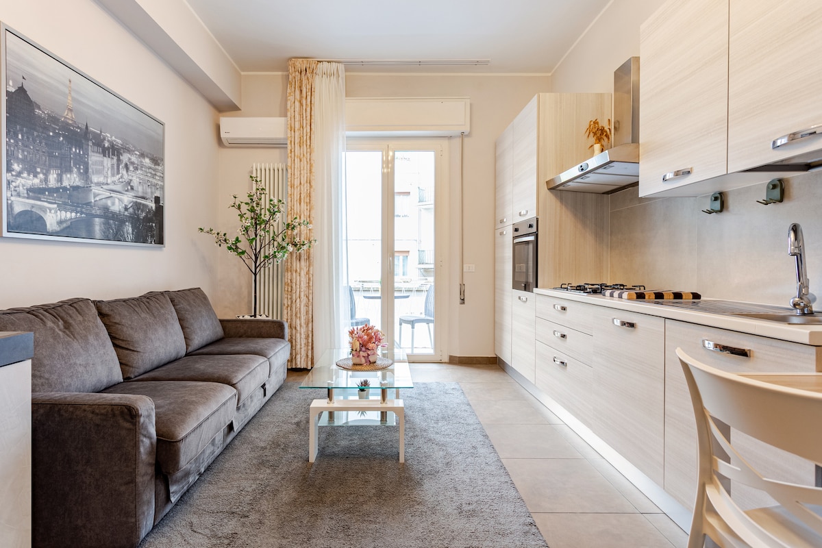 Bilocale con terrazzo, ideale per soggiorni business, coppie o famiglie. Nel centro storico di Rimini, vicino al Palacongressi, alla stazione (1 fermata per la Fiera) e al mare. Camera con letto matrimoniale, cabina armadio e TV; zona giorno con divano letto, tavolo e seconda TV. Cucinino con microonde, frigo, bollitore e caffè Illy. Bagno privato. Wi-Fi veloce, Smart TV, aria condizionata e lavatrice. Culla e seggiolone su richiesta. Parcheggi e ristoranti vicini. Accesso alla cucina Coliving