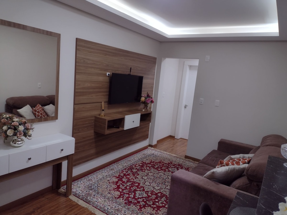 Esta acomodação elegante é perfeita para viagens em grupo e sozinhos, acomoda até 5 pessoas. Temos uma cama de casal e 1 cama de solteiro em um quarto confortável ar-condicionado quente e frio, TV Smsrt com Netflix logada,em outro quarto 2 camas de solteiro q juntas vira cama de casal confortável,local para trabalho internet 500 mega, impressora, todo o apartamento é climatizado! Cozinha: fogão de indução e panelas de indução, depurador de gordura, todos utensílios e todos aparelhos elétricos.